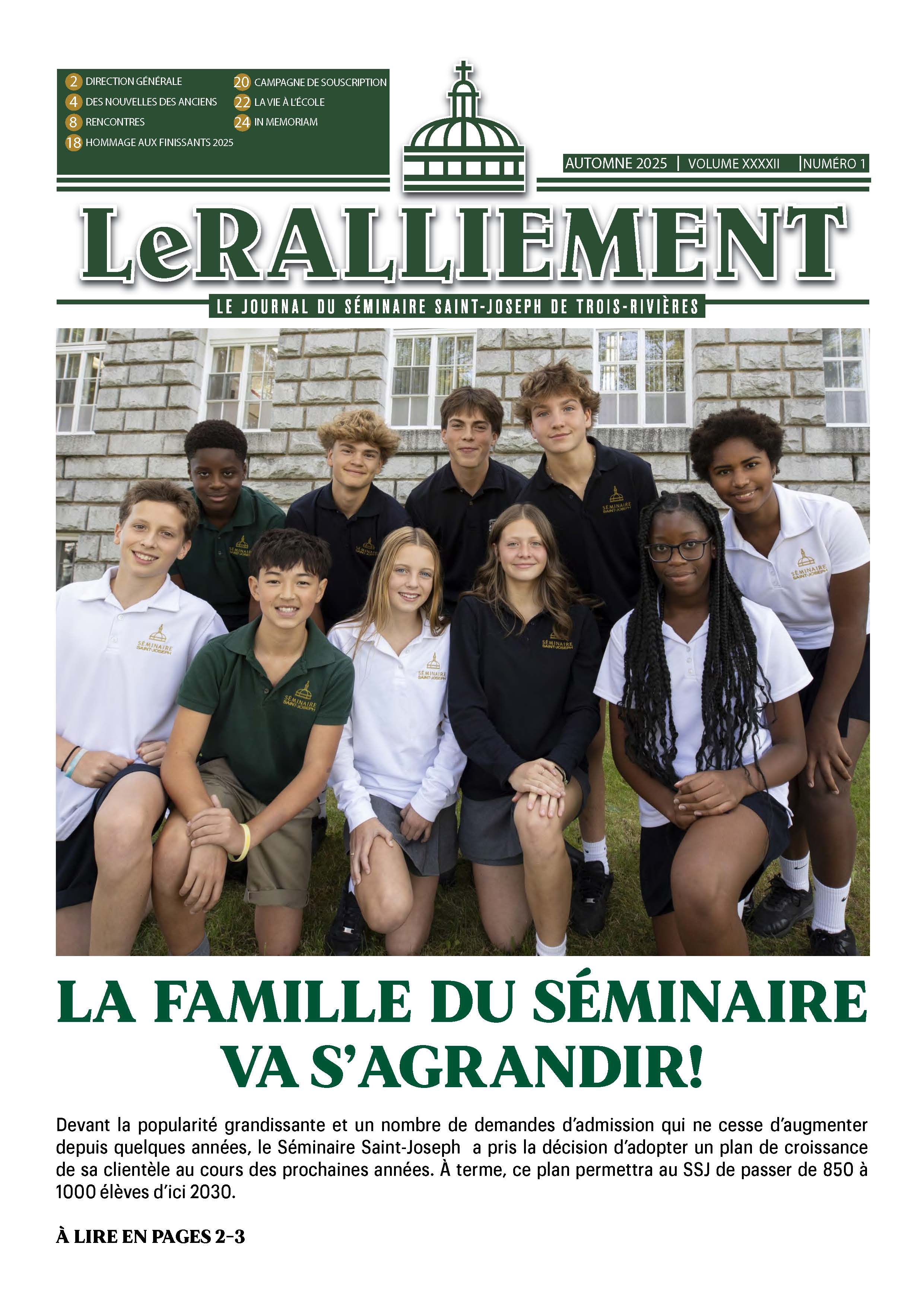 Le Ralliement est publié deux fois par année, soit à l’automne et au printemps et sera désormais produit en version numérique. Il sera donc expédié par courriel à l’adresse électronique se trouvant dans notre liste des Anciens. Si vous ne nous avez pas encore fait parvenir d’adresse électronique, nous vous invitons à le faire en communiquant à l’adresse suivante : fondation@ssj.qc.ca.